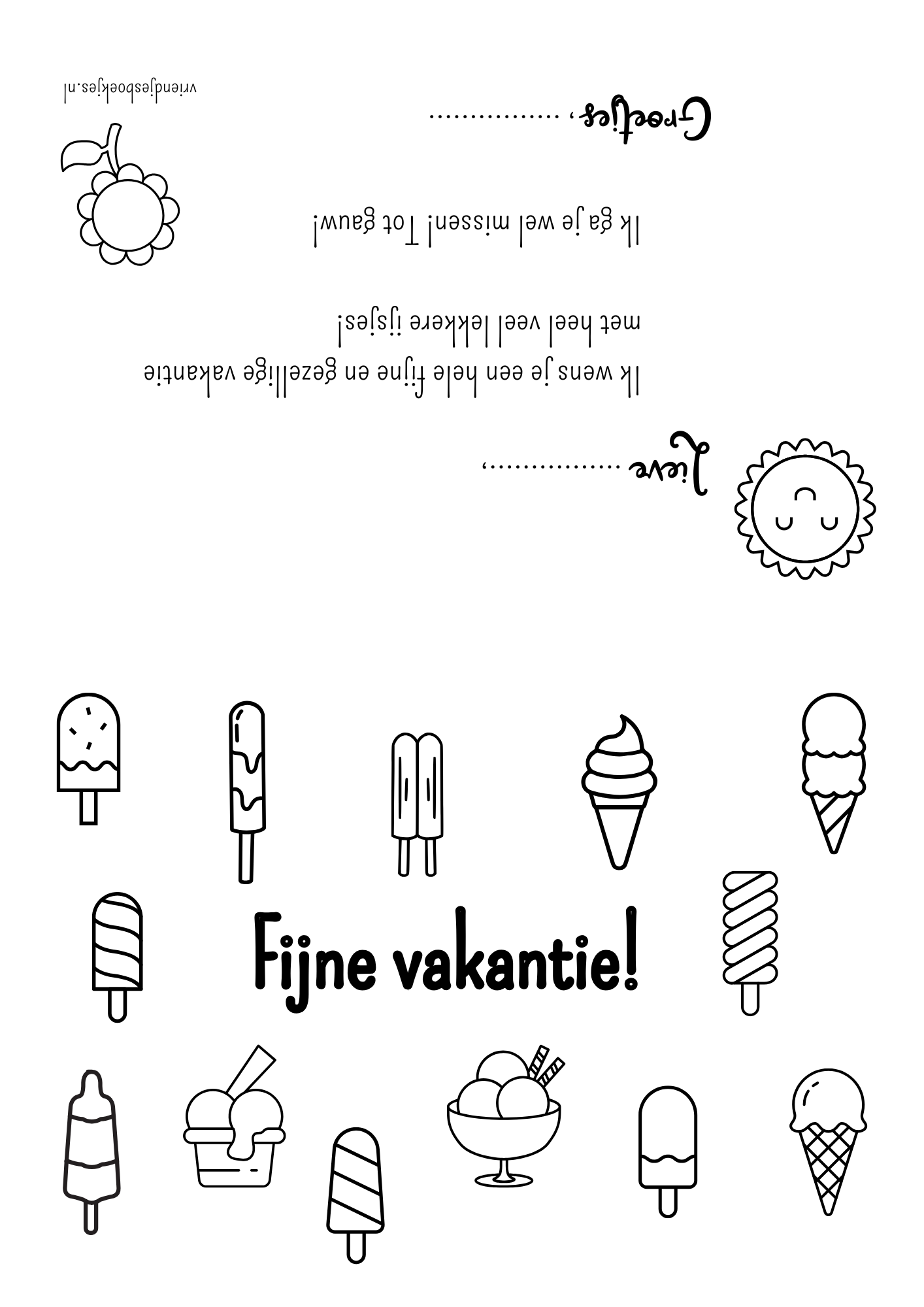 Verras een klasgenoot, vriendje, buurkindje, familielid of leerkracht met dit vrolijke kaartje voor de zomervakantie. De kaart staat vol ijsjes om mooi in te kleuren en bevat een zonnige boodschap. Print uit, vouw dubbel, kleur en vul in en de kaart is klaar om te geven!